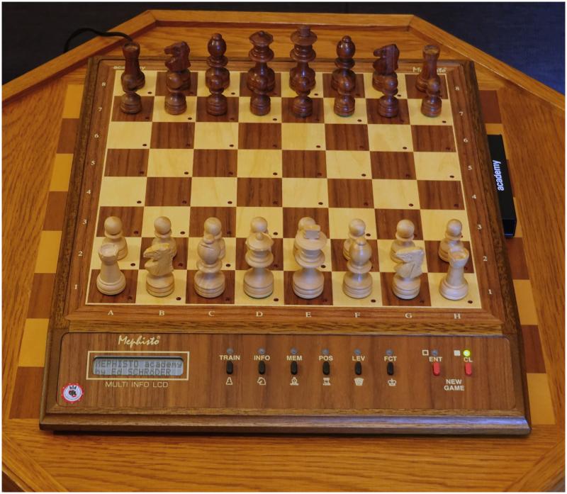 Nach dem frühen „Anfüttern“ in den Kaufhäusern der Achtziger [vieles dazu hier schmunzelnd gelesen] ließ mich das Fieber auch nie mehr los. Aber „erst“ in den frühen Neunzigern war mir so eine Anschaffung möglich und ich war dann lange glücklich und erfüllt mit einem 'Exclusive', damals natürlich noch mit einem der älteren Module. In der Zwischenzeit bis heute hatte ich immer wieder mal elektronischen Beistand. Meist waren es kleine Reisegeräte von Mephisto, so richtig hatte mich das aber nie befriedigt, es war eben die Lösung für unterwegs. Und wie es so ist, gab es in meinem Leben auch vereinzelt Phasen der totalen Schachabstinenz, aber nie für sehr lange. Schach war am Ende immer stärker als die Zerwürfnisse des Lebens.