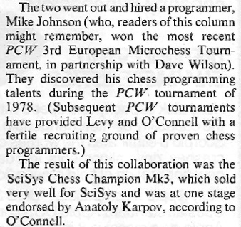 AlexS, so wie ich das verstanden habe, meinte David Levy mit dem 6502-Programm den Chess Champion Mark V, David Broughton's Z80-Programm, portiert von Mark Taylor.