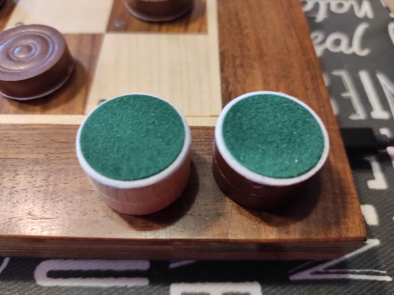 Nun habe ich mir Dame-Steine aus Holz und die entsprechenden RFID Chips Ø25 bei Amazon besorgt und zusammen geklebt. Die Filzplättchen hatte ich noch.
