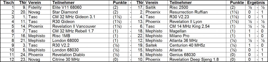Nach einer seltsamen Eröffnung waren beide Computer nach zwei Zügen aus dem Buch, um im folgenden wieder dort weiter zu spielen.