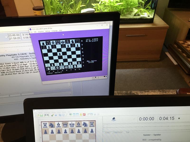 Zuerst zeigt der Glasgow mal was in ihm steckt. Und in der nächsten Partie gibt es ein von beiden Geräten reklamiertes Remis. [Event "40/120 68000er"] [Site "SCW"] [Date "2021.01.04"] [Round "1"] [White "GM Petrosian Glasgow 25 mhz"] [Black "Colossus Chess 4 C64 4mhz"] [ECO "B01"] [Result "1-0"] 1. e4 d5 2. exd5 Nf6 3. Bb5+ Bd7 4. Bc4 b5 5. Bb3 Bg4 6. f3 {"} Bf5 {"} 7. Qe2 a6 8. Qe5 Bg6 9. a4 Nbd7 10. Qc3 bxa4 11. Rxa4 Nb6 12. Qc6+ Qd7 13. Qxd7+ Nfxd7 14. Ra5 Bf5 15. d4 e5 16. dxe6 Bxe6 17. Bxe6 fxe6 18. Rg5 h6 19. Rg3 e5 20. Ne2 Nd5 21. O-O Rb8 22. dxe5 Nxe5 23. Nf4 Nxf4 24. Bxf4 Nc6 25. b3 Nd4 26. Re1+ Kf7 27. Bxc7 Rb7 28. Be5 Nxc2 29. Rc1 Rxb3 30. Nd2 Rb5 31. Bxg7 Bxg7 32. Rxc2 Be5 33. Rh3 a5 34. Nc4 a4 35. Nxe5+ Rxe5 36. Rh4 a3 37. Rc7+ Kg6 38. Ra7 Re1+ 39. Kf2 Ra1 40. Rha4 Ra2+ 41. Kg3 Re2 42. R4a6+ Kh5 43. Rg7 Rhe8 44. Ra4 Rxg2+ 45. Kxg2 {Matt in 9} Re2+ 46. Kg3 {Matt in 3} Rg2+ 47. Kxg2 a2 48. Ra5+ Kh4 49. Rg4# 1-0 [Event "40/120 68000er"] [Site "SCW"] [Date "2021.01.05"] [Round "1"] [White "Chessmaster2100 C64 4mhz"] [Black "GM Petrosian Glasgow 25mhz"] [ECO "E43"] [Result "1/2-1/2"] 1. d4 Nf6 2. c4 e6 3. Nc3 Bb4 4. e3 b6 5. Bd3 Bb7 6. Nf3 {"} Ne4 7. Bxe4 Bxe4 {"} 8. O-O Bxc3 9. bxc3 Nc6 10. Re1 O-O 11. Nd2 Bd3 12. e4 f5 13. e5 Na5 14. Qa4 f4 15. Ba3 Rf7 16. Rad1 c5 17. dxc5 Qc8 18. Ne4 Bxe4 19. Rxe4 f3 20. cxb6 axb6 21. gxf3 Nc6 22. Qb3 Rxf3 23. c5 Qe8 24. Re2 Qe7 25. Kg2 Rf5 26. Bb2 bxc5 27. c4 Qg5+ 28. Kh1 Nxe5 29. Bxe5 Rxe5 30. f4 Qxf4 31. Rg2 Re4 32. Rdg1 g6 33. Qb7 Ra4 34. Qc8+ Qf8 35. Rxg6+ hxg6 36. Rxg6+ Kf7 37. Rf6+ Kxf6 38. Qxf8+ Kg6 39. Qg8+ Kf5 40. Qf7+ Kg4 41. h3+ Kg3 42. Qg6+ Kf3 43. Qf6+ Ke3 44. Qc3+ Kf4 45. Qf6+ Ke3 46. Qc3+ Kf4 47. Qf6+ Kg3 48. Qg6+ Kf4 49. Qf6+ 1/2-1/2 Code: