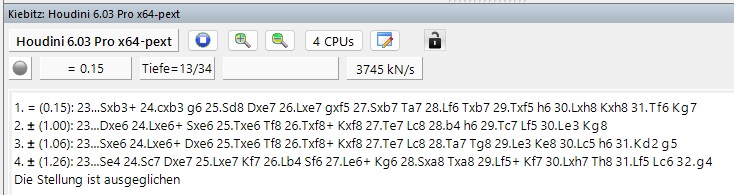 auch auf die Gefahr hin, dass ich umgehend von einem fliegenden Magellan aus Wien getroffen werde, selbst Houdini 6.03 hat den Zug 23…Sxb3+ kurzzeitig (sehr kurz) auf dem Schirm und zwar mit folgender Variante: