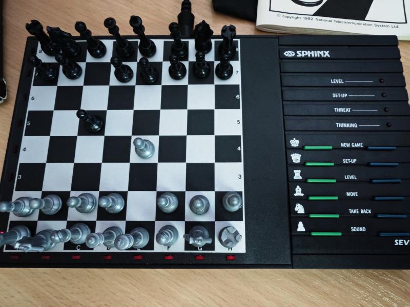 [Event "40/120 zep_tepi"] [Site "SCW"] [Date "2024.07.09"] [Round "1"] [White "Fidelity CC Grandmaster Voice"] [Black "Video Chess Ti99/4A"] [ECO "B28"] [Result "1-0"] 1. e4 c5 2. Nf3 a6 3. Nc3 {"} Nc6 {"} 4. Be2 Nd4 5. Nxd4 cxd4 6. Na4 Nf6 7. d3 d6 8. b3 b5 9. Nb2 {das Springerfianchetto} Be6 10. O-O Rc8 11. Bg5 g6 12. Bxf6 exf6 13. Bf3 Bg7 14. Re1 O-O 15. Qd2 Ra8 16. Re2 Qd7 17. Rae1 f5 18. exf5 gxf5 19. Bxa8 Rxa8 20. a4 bxa4 21. bxa4 Qb7 22. Qc1 Bd5 23. Re7 Qc6 24. f3 Be5 25. Qg5+ Kh8 26. Qc1 Rg8 27. g3 Qb6 28. Kf2 Qc5 29. f4 Bf6 30. R7e2 Bc6 31. Kf1 Qa3 32. Qa1 Qxa1 33. Rxa1 Rb8 34. Nc4 Rd8 35. Ra2 Kg8 36. Nd2 Bd5 37. Rb2 Ba8 38. Rb6 Bg7 39. Rxa6 Bb7 40. Ra7 Bc6 41. a5 Ba4 42. Nc4 Bc6 43. Ree7 Be8 44. a6 Bf8 45. Reb7 Bg7 46. Ke2 Bh8 47. Rb6 Ba4 48. Kd2 d5 49. Nb2 Be8 50. Rab7 Bd7 51. Rd6 Rf8 52. Rdxd7 Bg7 53. a7 Bf6 54. Rb8 h5 55. a8=Q Bg7 56. Rxd5 Rxb8 57. Qxb8+ Bf8 58. Rd8 Kh8 59. Qd6 Kg7 60. Qxf8+ Kg6 61. Rd6+ f6 62. Qg8+ {Natt in 2} 1-0 So, gerade kam der neue Teilnehmer an. Eine CXG Sphinx Seville, CXG - 807 d.h. ein 4 Bit Schachprogramm. Quasi ein Taschenrechner der versucht Schach zu spielen. HD614042SJ02 Prozessor, ca. 1 MHz (3,58 MHz Quarz) und 256 Digits x 4-bit 4096 Words x 10-bit, Programm von Levy und Taylor. Ich hatte früher auch mal einen Taschenrechner von Casio der konnte 512 Bytes Programm speichern. Code: