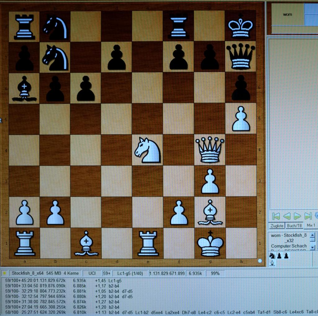 Für mich lag die Begründung dafür darin, dass b2-b4 auch nicht schlecht ist, und Lc1-g5 eben nur lange Zeit ein bisschen schlechter bewertet wird. Bereits nach 35 Stunden war "Lc1-g5" auf dem Schirm als aktuelle berechneter Zug. Dann kam meine Nachtruhe, und als ich am Morgen schaute: Immer noch Lg5 berechnet, aber als bester Zug noch b2-b4. Und plötzlich änderte es sich zu dem, was auf dem Foto gezeigt wurde. ![]() Gruß Wolfgang |