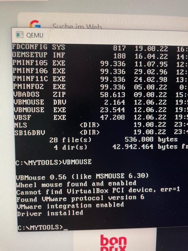 ... das Hauptproblem war immer, daß sich die Maus nur innerhalb eines Teilbereichs des Qemu-Fensters bewegen ließ, sodaß praktisch kein Schachprogramm sinnvoll zu bedienen war. . Grüße, Franz Und beim Mausproblem kann ich helfen, das könnte allen nutzen. Für freedos habe ich mir einen Maustreiber besorgt, VBMOUSE.EXE, der befreit die Maus aus diesen Zwängen, frei bewegbar ohne Ctrl-Alt! Ich weiß nicht mehr genau wo ich den geladen habe. Hier? https://www.vogons.org/viewtopic.php?p=1062810 Zu meinem Erstaunen läuft es auch unter qemu, gestern ausprobiert! Siehe Grafik |