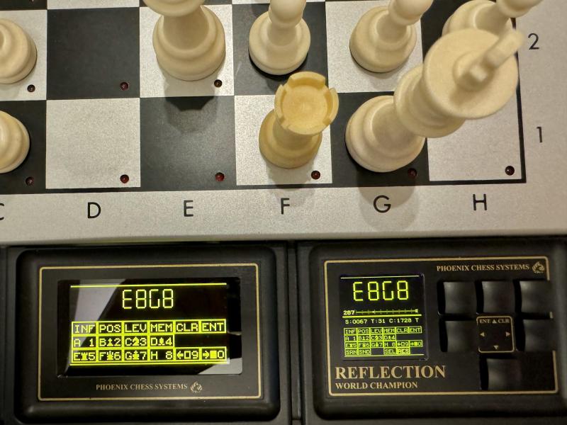Allmählich verdichtet sich bei mir doch der Eindruck, dass bei den späteren Novag-H8-Rechnern nicht nur Modell- sondern auch etwas Programmpflege geschehen ist. Turquoise macht in den Partien gegen seine Vorgänger einfach so manchen planungstechnischen Fehler weniger. Und wenn die Partieanlage in die falsche Richtung läuft, hilft eben auch die geringfügig stärkere Rechenkraft eines Siglo XXI nichts. Er muss in der 23. Etage wohnen bleiben. ![]() Für Turquoise geht im Stockwerk darüber nun gegen den - er ist eben in aller Munde - Mephisto Glasgow III-S auf Reflection II. Novag Turquoise - Novag Aquamarine Siglo XXI Risc II 26,6 MHz 2,5:1,5