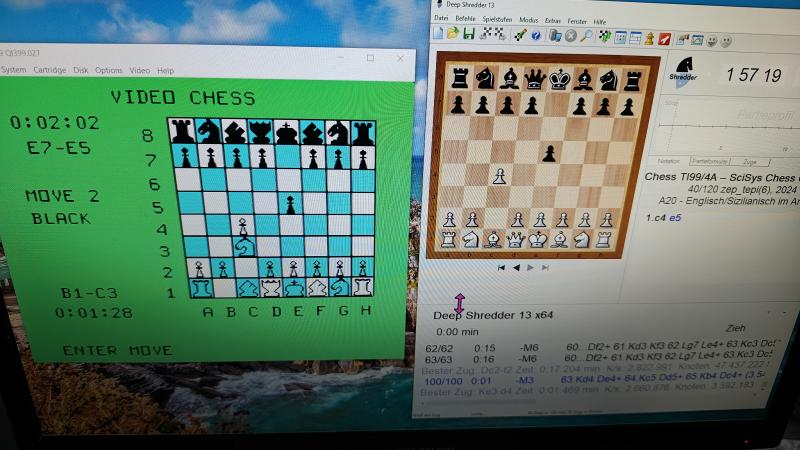 In der ersten Partie der 6. Runde geht es nun weiter mit Video Chess auf dem TI 99/4A gegen den MKIV von SciSys.