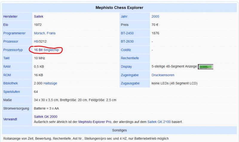 Der Mephisto Chess Explorer soll laut Wiki mit einem "16 Bit Singlechip" ausgestattet sein, was ich nicht glauben kann. Verstehe ich vielleicht etwas einfach nur nicht richtig?