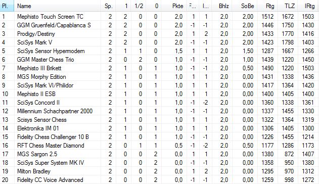 U1500 Deep Depp Advanced Partien Runde 4 - 11.02.2016. 1 Mephisto Touch Screen TC - Prodigy/Destiny ..... 2 SciSys Mark V - SciSys Sensor Hypermodern ..... 3 GGM Gruenfeld/Capablanca S - MGS Morphy Edition ..... 4 Mephisto III Brikett - SciSys Mark VI/Philidor ..... 5 GGM Master Chess Trio - Mephisto II ESB ..... 6 Fidelity Chess Challenger 10 B - Milton Bradley ..... 7 Millennium Schachpartner 2000 - Elektronika IM 01 ..... 8 SciSys Concord II - MGS Sargon 2.5 ..... 9 RFT Chess Master Diamond - Scisys Sensor Chess ..... 10 SciSys Super System MK IV - Fidelity CC Voice Advanced ..... Tabelle nach Runde 3: Die Favoriten setzen sich bereits oben ab (bis Platz 10). Der Prodigy liegt momentan mit 3 aus 3 vorne, ebenso überraschend gut bislang der Sensor Chess mit Hypermodern Modul. |