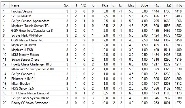 Hallo, die 3. Runde ist fast beendet. Nur die Partie Mephisto ESB II-SciSys Concord II fehlt noch. Hier die Ergebnisse mit ein paar Anmerkungen: