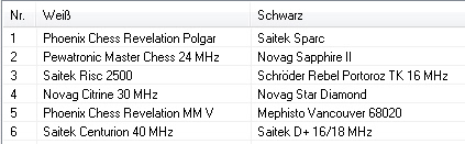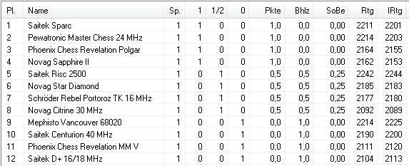 2 Spiele der 2. Runde stehen noch aus. https://www.schach-computer.info/wik...Tabelle_A-Liga 1 Saitek Sparc 2,0 / 2 2 Novag Star Diamond 1,5 / 2 3 Pewatronic Master Chess 24 MHz 1,0 / 1 4 Revelation MM V 1,0 / 2 5 Revelation Polgar 1,0 / 2 6 Saitek Centurion 40 MHz 1,0 / 2 7 Novag Sapphire II 0,5 / 1 8 Saitek Risc 2500 0,5 / 1 9 Schröder Rebel Portoroz TK 16 MHz 0,5 / 1 10 Novag Citrine 30 MHz 0,5 / 2 11 Mephisto Vancouver 68020 0,0 / 2 12 Saitek D+ 16/18 MHz 0,0 / 2 |