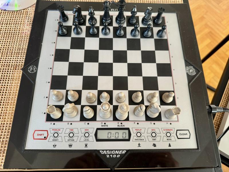 Es gelingt ihm, den Kishon Chesster nach der Eröffnung stetig unter Druck zu setzen. Der weiß bald nicht mehr, wohin mit seiner Dame und muss schließlich, damit die Lady überleben kann, die Qualität geben. Danach schafft es der Designer sehr gut, seinen Vorteil immer weiter auszubauen und kann nach acht Partien gegen seinen nahen Verwandten endlich den Gesamtsieg verbuchen. Lob aber auch an den kleinen Kishon Chesster: Er hat solides Schach geboten und gut dagegen gehalten. Fidelity Kishon Chesster - Fidelity Designer 2100 Display 3,5:4,5