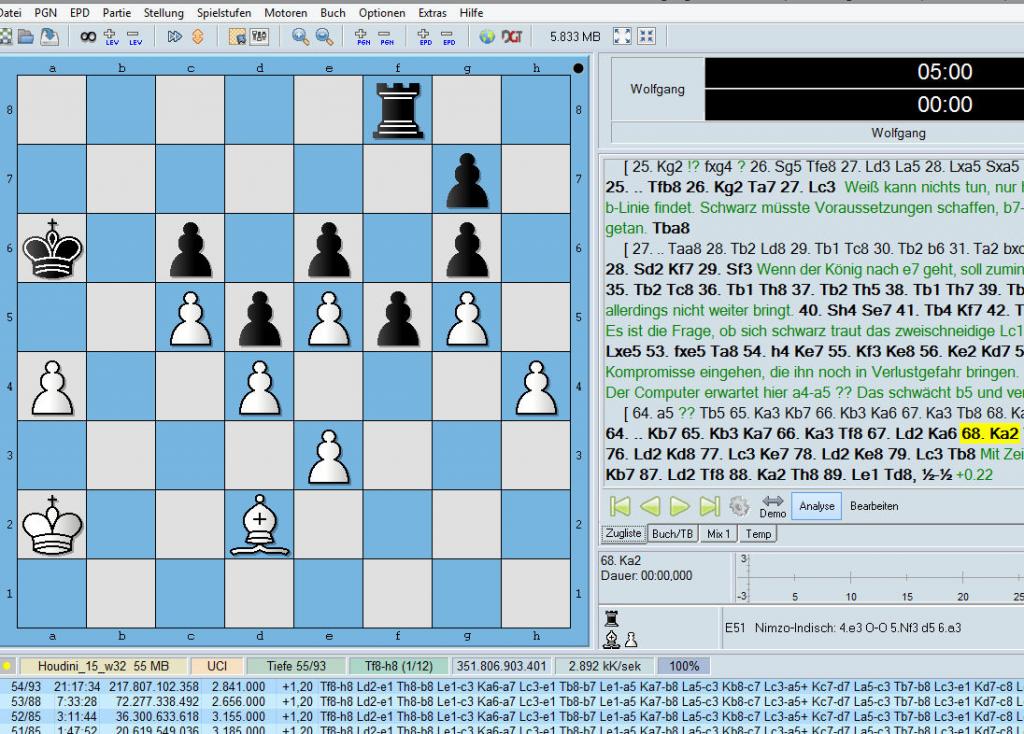 ich habe Houdini mal eine Langzeitanalyse an dieser Teststellung gegönnt. 351.806.903.401 Knoten hat er angeblich untersucht. (Knotenleistung: ca. 2.9 Millionen pro Sekunde). Das Ergebnis ist nach wie vor nichts. Selbst bei einer Suchtiefe von beeindruckenden 55/93 Halbzügen. Allerdings halte ich es für denkbar, dass es Programme gibt, die vielleicht längst nicht so stark sind, aber in dieser Hinsicht trotzdem "schlauer" sind. Gruß Wolfgang |