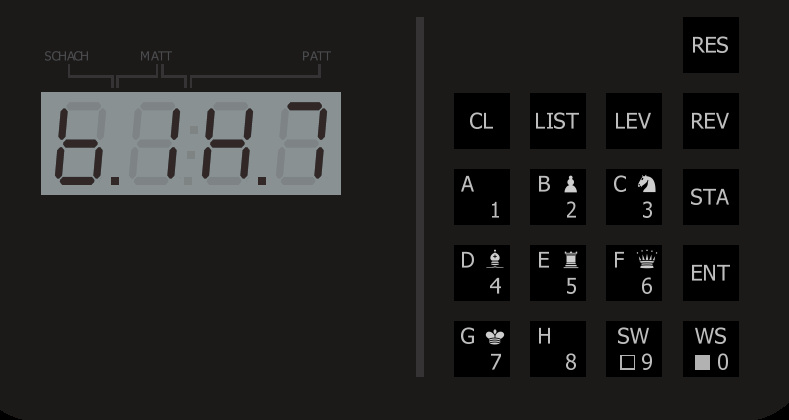 1. 8h 07min. 28sek. ?? 2. 0h 00min. 18sek. ! 3. 0h 00min. 04sek. 4. 0h 00min. 01sek. Mephisto III 6,1 Mhz Mattstufe Code: