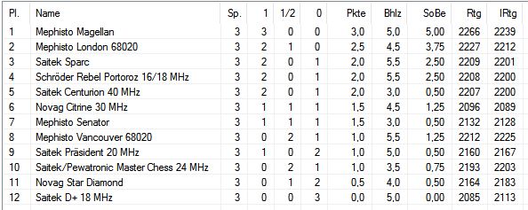 Citrine hätte ein Remis gereicht und es wurde dann auch eine ausgeglichene Stellung erreicht und ins Endspiel übergeleitet. Dort zeigte der Novag aber dem Morsch, daß er nicht allein Endspiele vermurksen kann und der Präsident bekam eine Steilvorlage am Damenflügel, die er auch gleich zu nutzen wußte. Somit konnte der Präsi noch an Citrine vorbei ziehen und diese in die B-Liga schicken, auch mit Unterstützung des Star Diamond, der sein Spiel ja ebenfalls nicht gewinnen konnte.