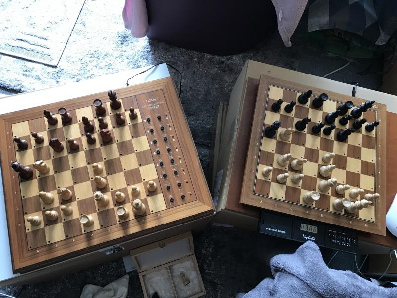 [Site "SCW"] [Date "2023.06.22"] [Round "16"] [White "Novag Constellation Expert"] [Black "Mephisto Montreal 68000"] [ECO "C42"] [Result "1/2-1/2"] 1. e4 e5 2. Nf3 Nf6 3. Nxe5 d6 4. Nf3 Nxe4 5. d4 Be7 6. Bd3 Nf6 7. h3 O-O 8. O-O c5 9. d5 {"} Nbd7 {"} 10. c4 Ne5 11. Re1 Nxd3 12. Qxd3 Re8 13. Nc3 Qd7 14. Bd2 Qf5 15. Qxf5 Bxf5 16. Nb5 Bf8 17. Bg5 a6 18. Nc7 Rxe1+ 19. Rxe1 Rc8 20. Bxf6 Rxc7 21. Bd8 Rd7 22. Bh4 h5 23. Nd2 f6 24. a4 Re7 25. f4 Rxe1+ 26. Bxe1 Be7 27. a5 g5 28. Kf2 Bc2 29. g4 hxg4 30. hxg4 f5 31. Ke3 fxg4 32. Ne4 gxf4+ 33. Kxf4 Bd3 34. b4 cxb4 35. Bxb4 Bxc4 36. Kxg4 Bxd5 37. Nxd6 Bf6 38. Kf4 Bb2 39. Ke3 Be5 40. Kd3 Kg7 41. Bc3 Kf6 42. Bd4 Bg2 43. Nc4 Bxd4 44. Kxd4 Ke6 45. Kc5 Kd7 46. Kb6 Be4 47. Nb2 Bd5 48. Nd3 Kd8 1/2-1/2 Stand nach 16 Partien also: 9 zu 7 für den Mephisto Montreal 68000. Das Bild stammt aus der 17.Partie die gerade läuft. Nach langer sizilianischen Eröffnung sind im 12.Zug beide Geräte aus dem Buch. Montreal hat weiss.