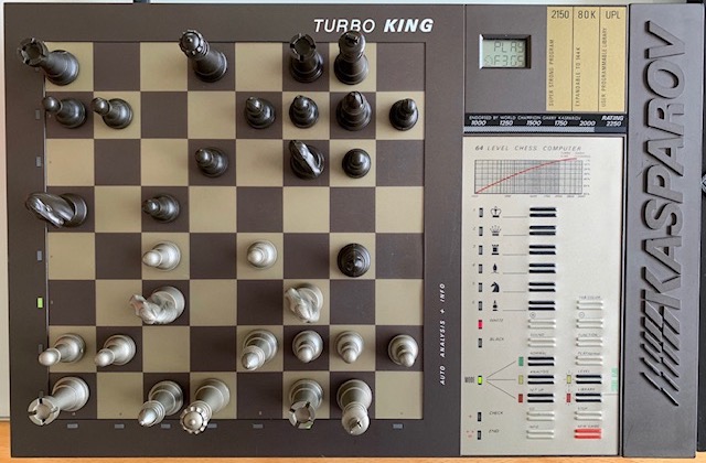 Den nächste Zweikampf auf Turnierstufe tragen die Elo-Tabellennachbarn SciSys Turbo King II mit Endgame-Rom und der Fidelity Designer 2100 Display aus. Beide liegen in der Privaten Turnierliste bei ca. 1900 Punkten. Turnierpartien der beiden gegeneinander konnte ich bisher keine finden. Während der Turbo King (D-Programm) auf einem 65C02 mit 5 MHz läuft, kann der Designer immerhin mit schnelleren 6 MHz aufwarten. Beide spielen in der Einschalt-Grundeinstellung.