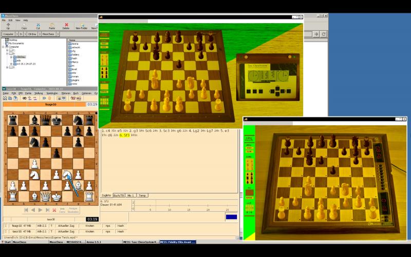 Arena wird bei mir tadellos dargestellt, die beiden Kontrahenten (V10 und Tasc R30) mit "Realistic Artwork" (aus Mamechess nach CB-Emu importiert und bearbeitet) sind etwas gelbstichig und der Hintergrund wird in falschen Farben wiedergegeben. Die Menues in den Fenstern funktionieren, die Menueschrift ist aber etwas launig. Das automatische Spiel gegeneinander funktioniert.
